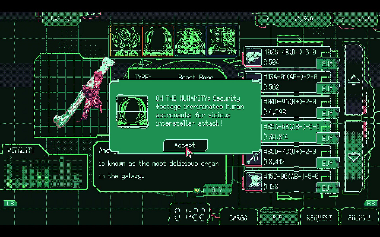 As I said earlier, I really never expected to like this game. I expected to just be bored, to get annoyed with all of the...well...everything. That held me back from starting this series for a long time. But once I started it I just kept playing. Sure, I had a few days there where I didn’t charge my Legion Go S so I couldn’t play it on the couch but I was still itching to play it and kept thinking about it. Again and again I thought “I need to charge that, I want to keep trading those organs”. This is what makes a good game. One that worms its way into your brain and just keeps you thinking about it even when you’re playing other games. As such, Space Warlord Organ Trading Simulator is a damn good game.