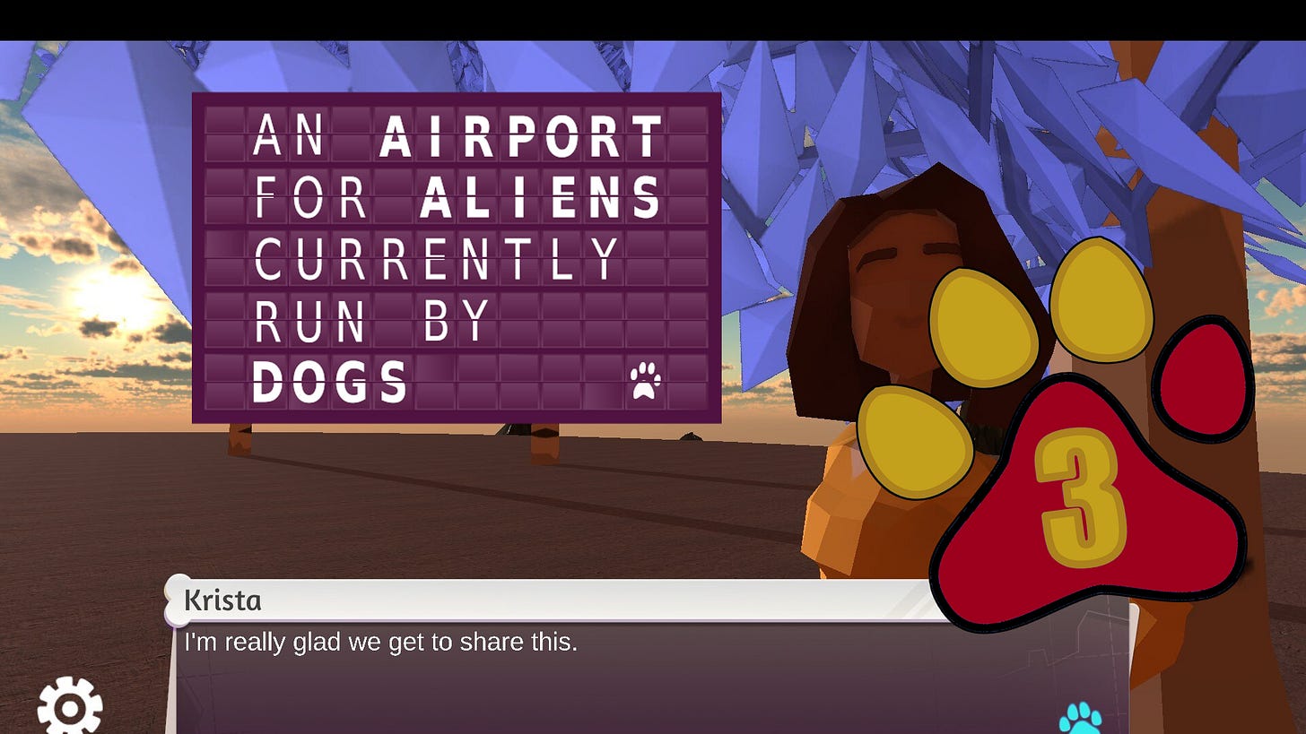 What is An Airport for Aliens Currently Run By Dogs, however? Okay, imagine a series of airports across the solar system run by 2D images of dogs. Then, imagine playing one of the last 2 humans in existence and you have to go around these airports choosing to do things for these dogs because...well...what else would you do after the whole human race has been destroyed? Over time you’ll also meet up with your fellow human survivor, your fiancé Karla, who is a scientist working for R&Dog. You’re engaged, but long distance so she can do her science...things and you can help dogs across the system. And now, imagine that these dogs are fucking strange beings that make little sense and just have absolutely nonsensical personalities. And that they ask you to do things that sometimes either dont make sense or have questionable reasoning. This game you’ve imagined is exactly what An airport for Al...fuck it, this game you’ve imagined is exactly what Dog Airport Game is about. Because this is The Premise section and describing the games’ premise to you is what it’s for.