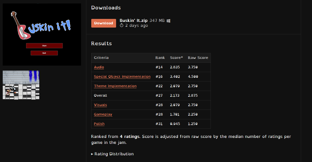 If you've got to the end, thanks so much for reading! Here's a link to the game if you want to play it, again it’s called Buskin It. I appreciate all feedback on it (it is just one level and needs polish so that you can even get to the end of the level though so no pressure to play it) and if you'd be interested in hearing more about my game development journey, especially after I eventually release my first fully fledged game that I've been working on most of the year, then comment below because I will happily talk more about it.